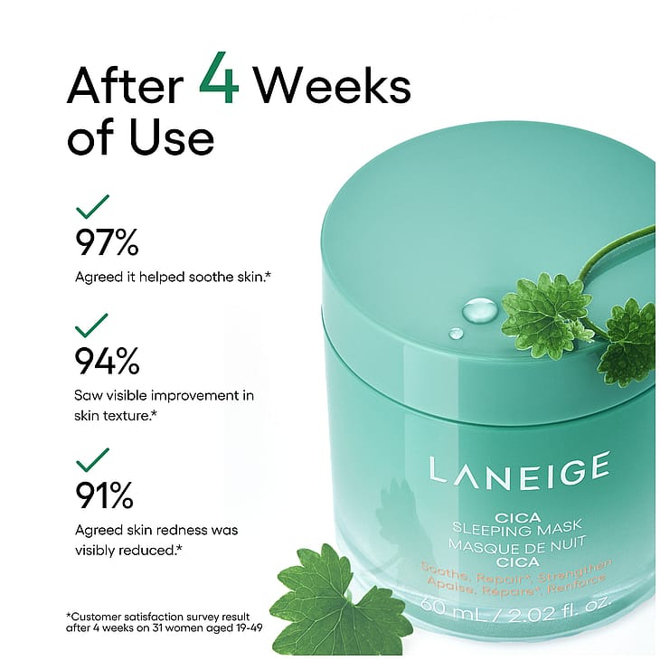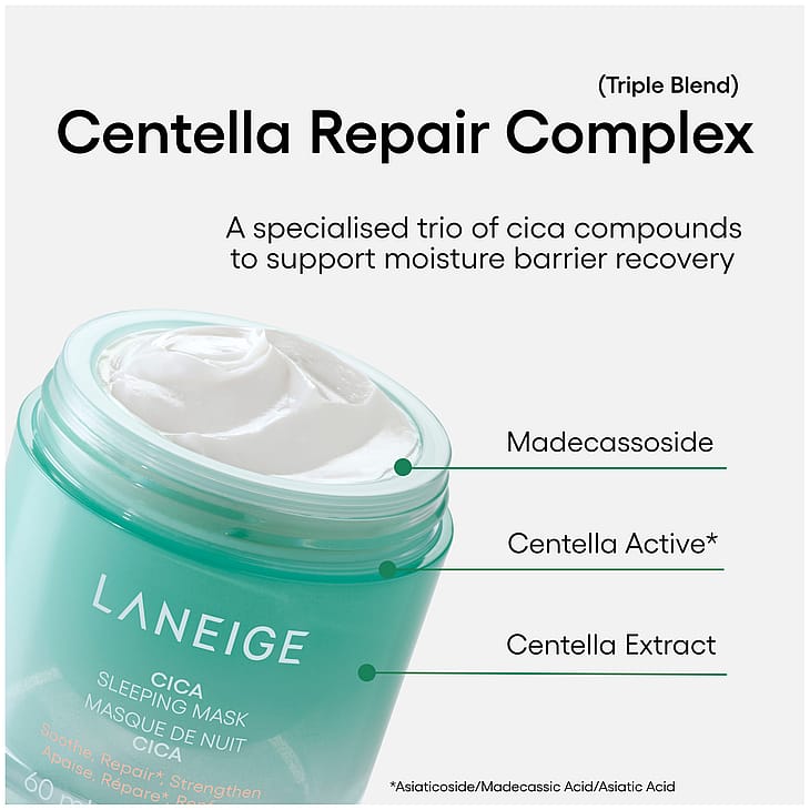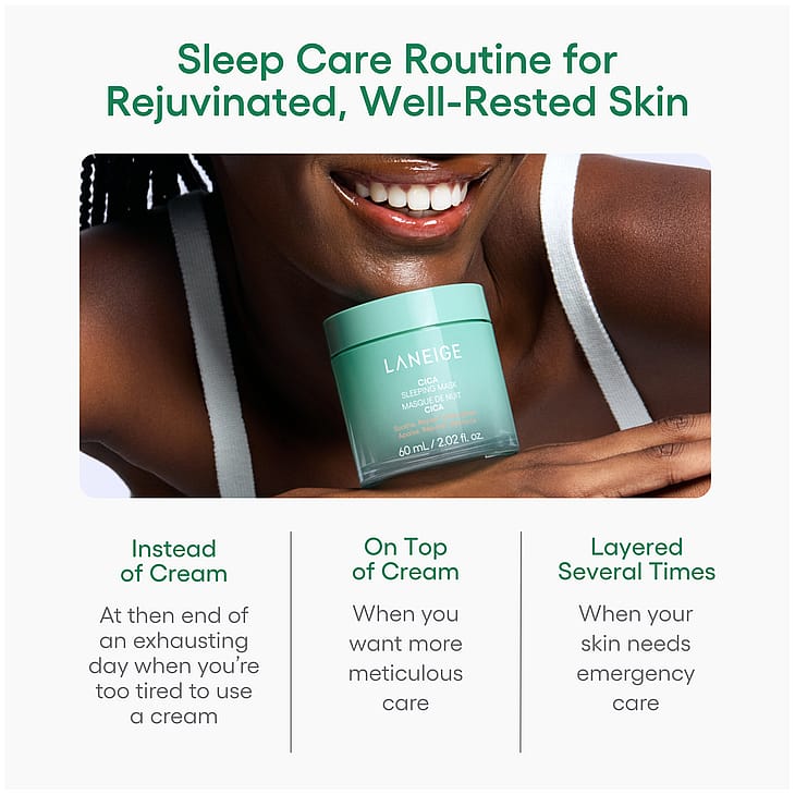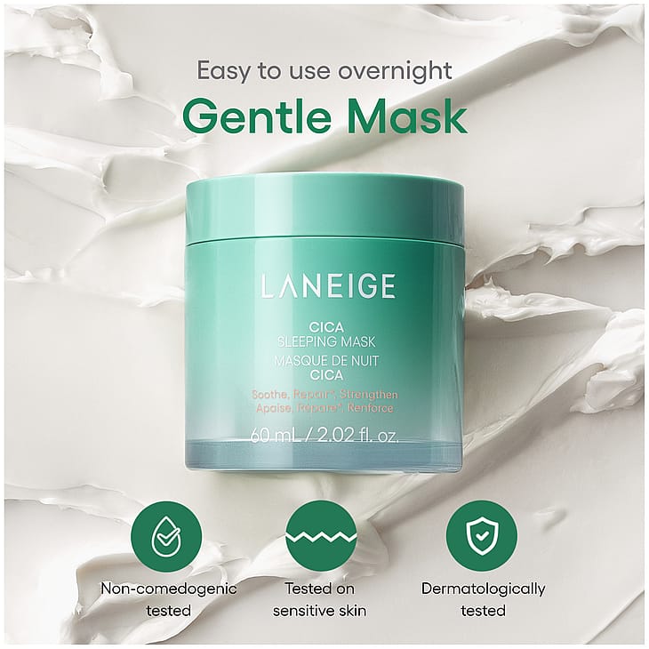 Rauhoita ja vahvista herkistynyttä ihoa yön aikana LANEIGE Cica Sleeping Mask -yönaamion avulla. Hoitava koostumus sisältää Jejun saaren köynnöksistä peräisin olevaa Forest Yeast -uutetta, joka auttaa vahvistamaan ihon suojakerrosta, kun taas Sleeping Micro Biome palauttaa ihon tasapainoa päivän aikana kertyneen rasituksen jälkeen. Sypressinlehtiuute tarjoaa tulehdusta rauhoittavaa hoitoa, mikä tekee tuotteesta ihanteellisen helposti ärtyvälle iholle. Hajusteeton, alkoholiton ja parabeeniton sulava voidekoostumus tuo välitöntä helpotusta ja pitkäkestoista mukavuutta.