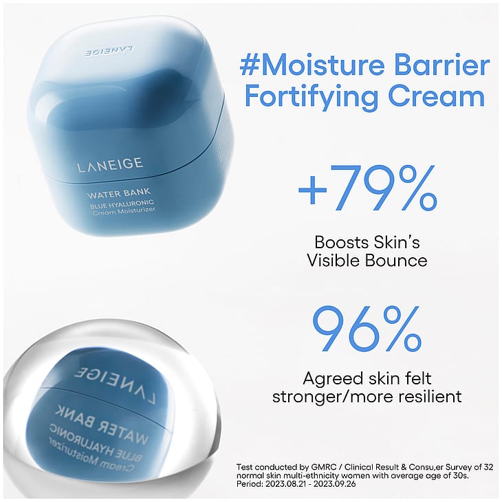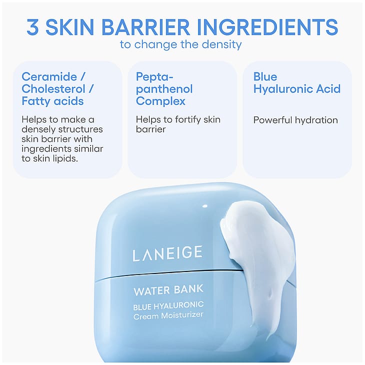 LANEIGE Water Bank Blue Hyaluronic Cream Moisturizer lukitsee kosteuden ihoon ja tarjoaa pitkäkestoista hoitoa kuivalle iholle. Ylellinen koostumus pehmentää, ravitsee ja tuo kasvoille luonnollista hehkua. Sininen hyaluronihappo mikrokoossa tehostaa kosteutusta ja imeytymistä. Päivittäiseen käyttöön sopiva voide tukee ihon kosteussuojaa jopa 100 tunnin ajan. Iho näyttää sileämmältä, kirkkaammalta ja tasaisemmalta.