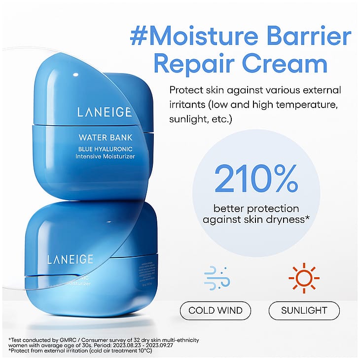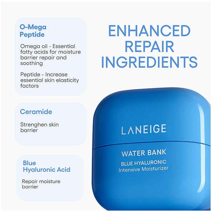 LANEIGE Water Bank Blue Hyaluronic Intensive Cream Moisturizer tarjoaa syväkosteutusta kuivalle ja herkälle iholle. Ravitseva koostumus sisältää skvalaania ja fermentoitua hyaluronihappoa, jotka sitovat kosteutta ja tekevät ihosta täyteläisemmän. Syvänmeren levä ja O-Mega Peptidikompleksi tukevat ihon suojamuuria. Iho jää pehmeäksi, rauhoittuneeksi ja kosteutetuksi pitkään.