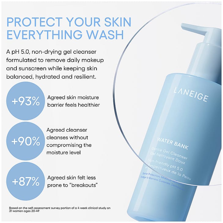 Puhdista iho hellävaraisesti mutta tehokkaasti LANEIGE Water Bank Gentle Gel Cleanserilla. Matalan pH:n geeli poistaa meikin, epäpuhtaudet ja aurinkosuojan kuivattamatta ihoa. Sininen hyaluronihappo, allantoiini ja aminohappoyhdistelmä kosteuttavat ja rauhoittavat. Geelistä muodostuu pehmeä vaahto, joka huuhtoutuu helposti pois. Iho jää puhtaaksi, pehmeäksi ja joustavaksi. Sopii normaalille ja kuivalle iholle. Dermatologisesti testattu.