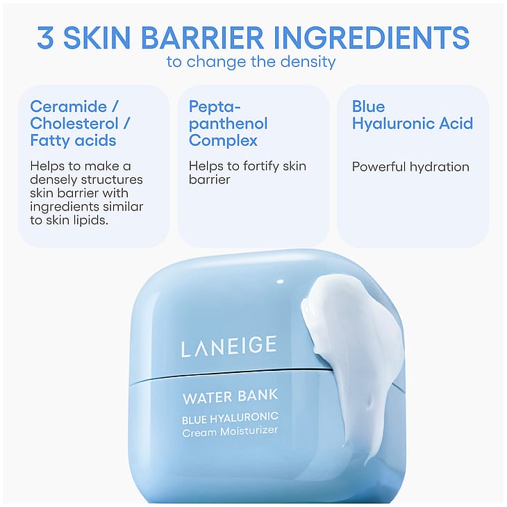 LANEIGE Water Bank Blue Hyaluronic Cream Moisturizer lukitsee kosteuden ihoon ja tarjoaa pitkäkestoista hoitoa kuivalle iholle. Ylellinen koostumus pehmentää, ravitsee ja tuo kasvoille luonnollista hehkua. Sininen hyaluronihappo mikrokoossa tehostaa kosteutusta ja imeytymistä. Päivittäiseen käyttöön sopiva voide tukee ihon kosteussuojaa jopa 100 tunnin ajan. Iho näyttää sileämmältä, kirkkaammalta ja tasaisemmalta.