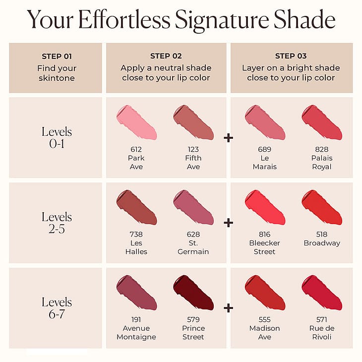 Saatavana 12 uudelleen täytettävää herkullista sävyä, jotka vaihtelevat arkisista nudesävyistä rohkeisiin punaisiin joka tilanteeseen ja ihonväriin.