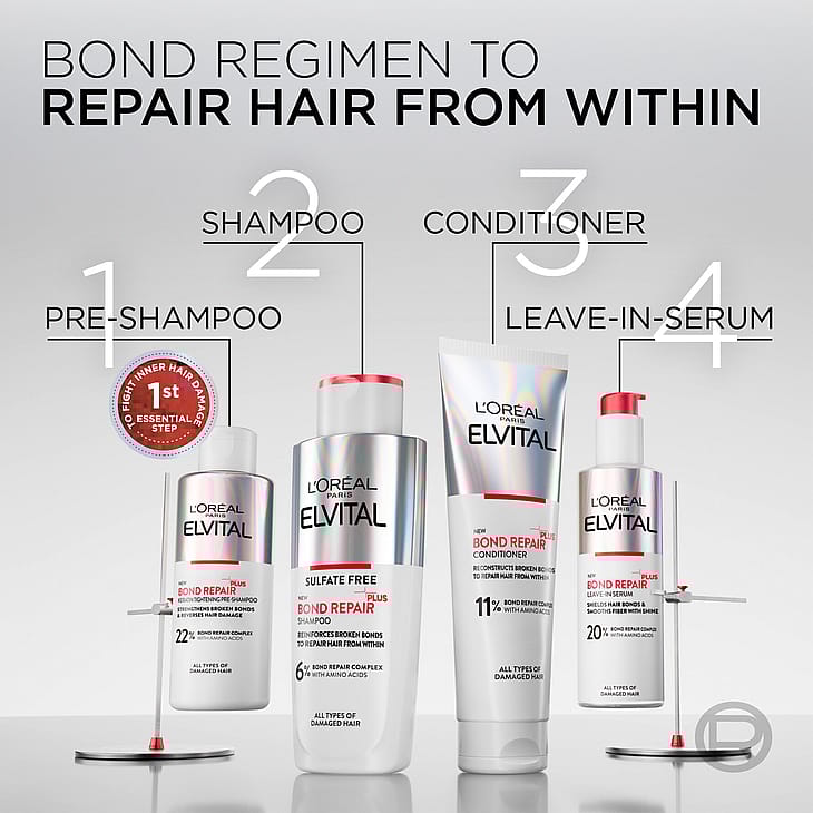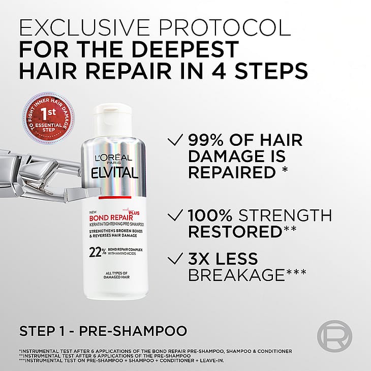 - Auta vaurioituneita hiuksiasi toipumaan kuormituksesta Elvital Bond Repair -sarjan ravitsevan esikäsittelyn avulla.