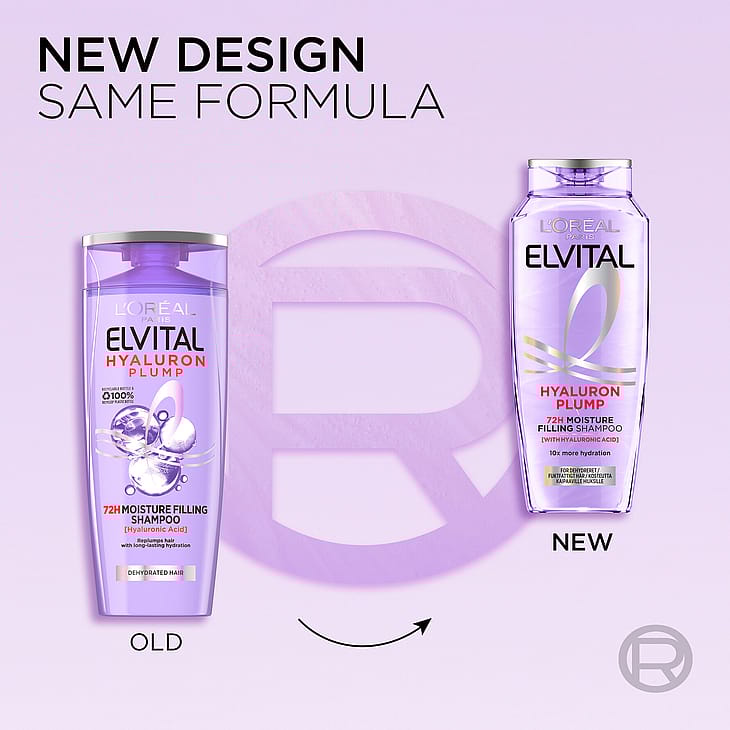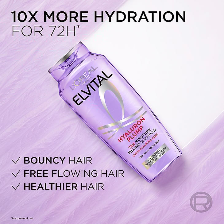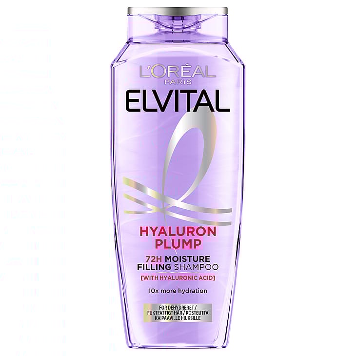 L'Oréal Paris Elvital Hyaluron Plump -shampoon koostumus sisältää hyaluronihappoa. Luonnollisesti ihmisen kehosta löytyvä molekyyli imee itseensä 1000 kertaa painonsa verran vettä ja auttaa tekemään hiuksista täyteläisemmät.