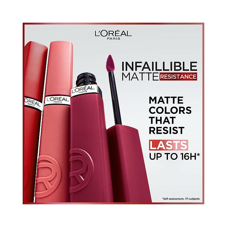 L'Oréal Paris, Infaillible Matte Resistance on pitkäkestoinen matta, nestemäinen intensiivisen värin antava huulipuna, joka kestää jopa 16 tuntia*. Matta hyaluronihappoa sisältävä kevyt koostumus levittyy helposti. Hienkestävä huulipuna ei tahraa eikä leviä ja kestää koko päivän. Pehmeän applikaattorin tarkka kärki tekee levityksestä helppoa ja antaa runsaasti väriä.