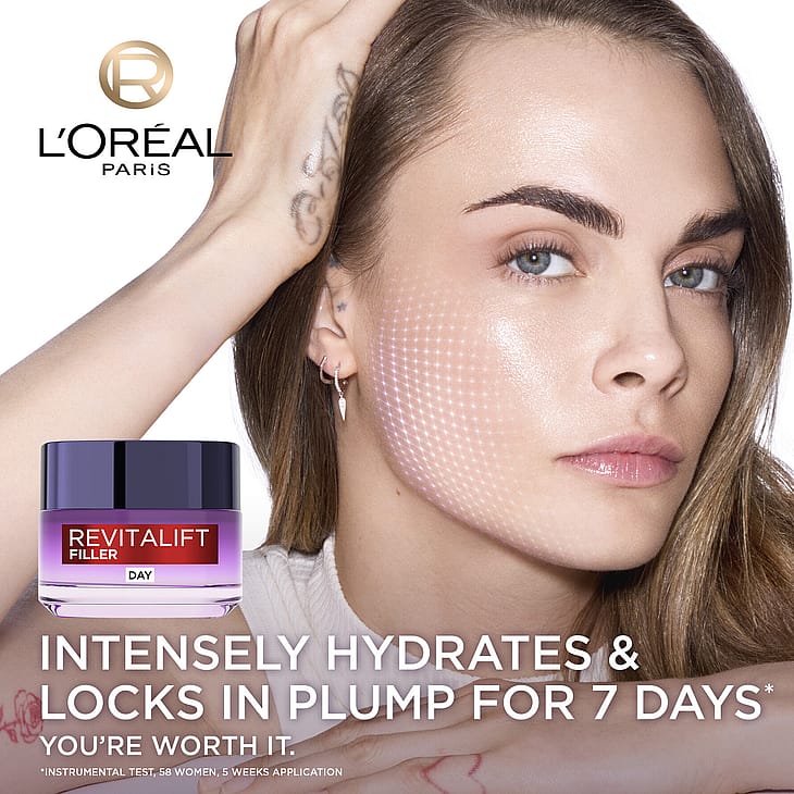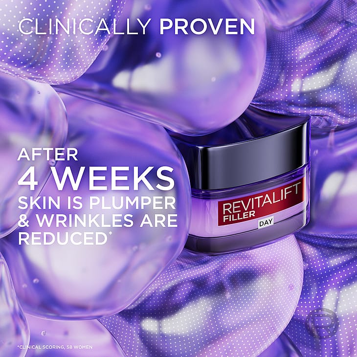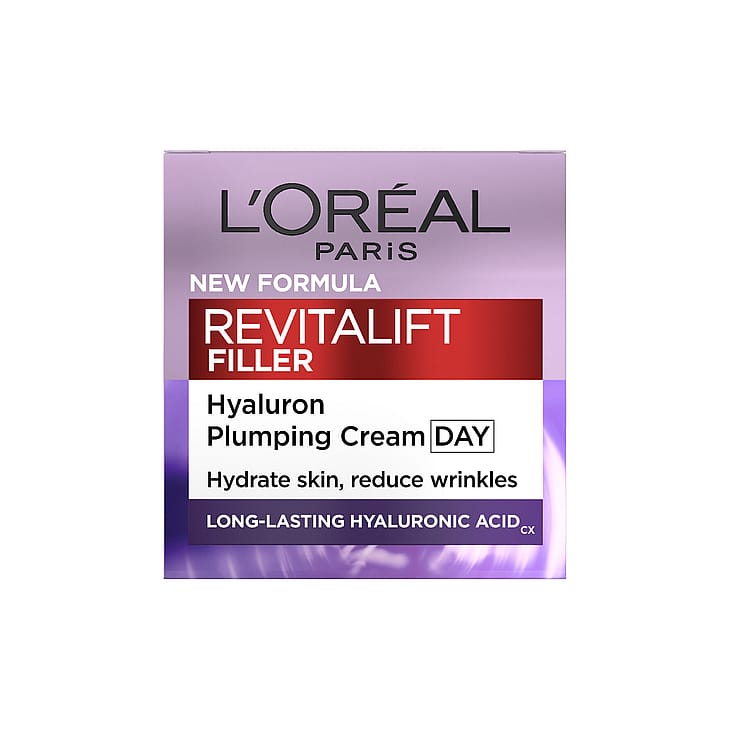 Naisille 40+. Kun haluat silottaa ryppyjä ja lisätä ihon täyteläisyyttä. Revitalift Filler [HA] on anti-age-päivävoide, jolla on täyteläistävä vaikutus. Ihon luonnollinen hyaluronihapon tuotanto vähenee iän myötä, minkä johdosta iholle ilmestyy ryppyjä. Iho menettää täyteläisyyttään ja kiinteyttään, ja kasvonpiirteet eivät ole enää niin selkeitä. Siksi L'Oréal Paris on kehittänyt uuden, korkean pitoisuuden hyaluronihappoa sisältävän anti-age-sarjan: Revitalift Filler [HA].UUTUUS: Uusi Revitalift Filler [HA] sisältää korkean pitoisuuden hyaluronihappoa ja glyseriiniä sekä Fibroxyl-kasviuutetta. Koostumuksen vaikutukset: – Silottaa ryppyjä ja juonteita – Vahvistaa ihon luonnollista suojamuuria – Lisää ihon pinnan täyteläisyyttä ja selkeyttää kasvonpiirteitä Käytä päivittäin hyvin puhdistetulle kasvojen ja kaulan iholle. Hiero kevyt päivävoide ylöspäin suuntautuvin liikkein. Käytä myös Revitalift Filler [HA] -seerumia. Vain muutama pisara seerumia riittää täydentämään päivävoiteen täyteläistävää vaikutusta.