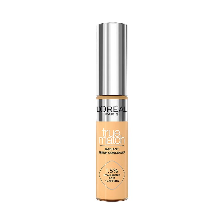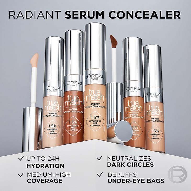 L'Oréal Paris True Match Radiant Serum -peitevoide antaa puolipeittävän/peittävän lopputuloksen, häivyttää tummia silmänalusia ja vähentää silmäpussien näkyvyyttä.
