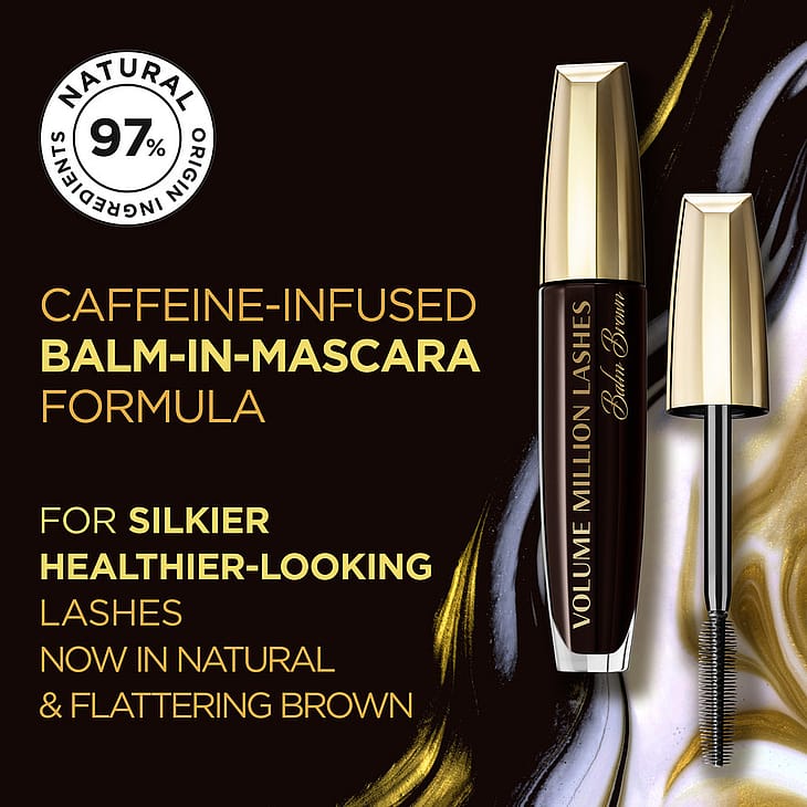 Volume Million Lashes Balm Brown -maskara antaa ripsille välittömästi määriteltyä tuuheutta imartelevassa tummanruskeassa sävyssä. Hypoallergeeninen koostumuksemme sisältää ripsihoitoa ja 97% luonnollista alkuperää olevia ainesosia ja se saa ripset näyttämään hyvinvoivilta tinkimättä kuitenkaan tuuheudesta ja kestosta. Voidemainen koostumus sisältää luonnollista alkuperää olevia öljyjä, jotka tekevät ripsistä pehmeät ja runsaat ja saavat ne näyttäämään 7x tuuheammilta*. Joustava harja ulottuu jokaiseen ripseen, koostumus levittyy vaivattomasti ja erottelee ripset ilman paakkuja. *Mittaustulos, 26 henkilöä.