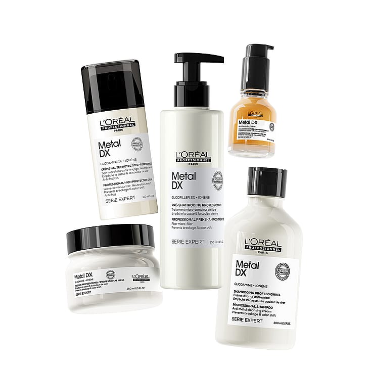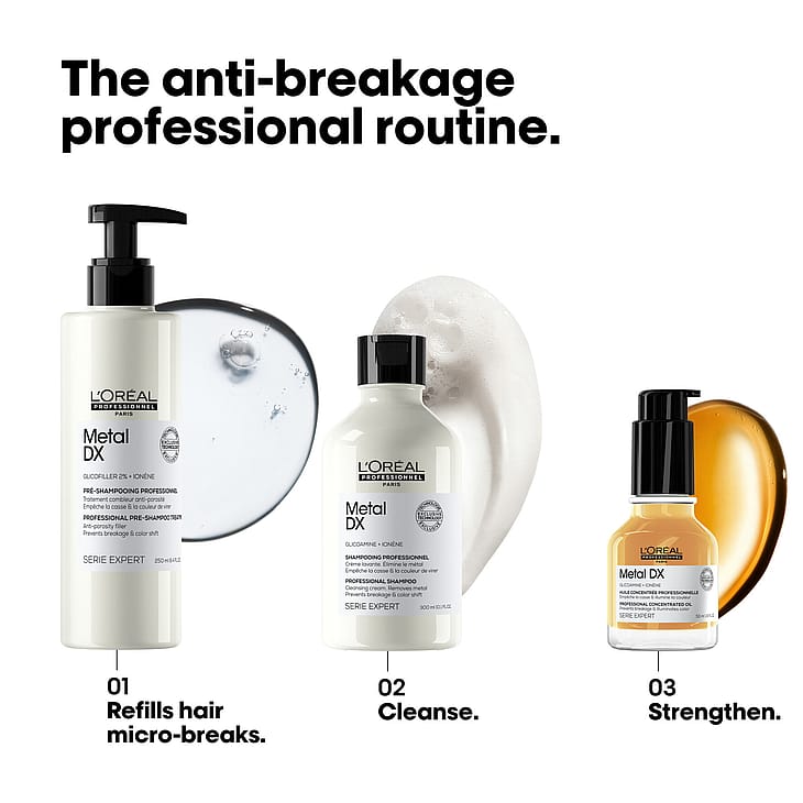 [KYSY METAL DX KAMPAAMOPALVELUSTA]: Seuraavalla kampaamokäynnilläsi, kysy Metal DX -hoitomenetelmästä, joka sisältää Glicoamine -ainesosaa ehkäisemään hiusten katkeilua ja hiusvärin muutoksia: 100% sävynmukainen ja pitkäkestoinen värjäystulos*** ja 99% vähemmän hiusten katkeilua****.