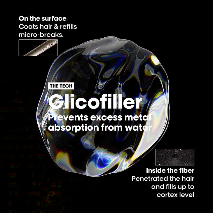 [TIETEELLINEN LÖYTÖ] Pesu pesulta metallihiukkasia, kuten kuparia, läpäisee hiuksen pinnan. Metallihiukkaset voivat aiheuttaa riskin hiusten katkeilulle ja hiusvärin muutoksille. [INNOVATIIVINEN TEKNOLOGIA] Sisältäen Glicofiller -ainesosaa, tämä shampoota edeltävä hoitotuote täyttää miljoonia mikrovaurioita jo ensimmäisellä käyttökerralla. Vaurioituneet hiukset vahvistuvat ja ovat suojatummat uusien metallihiukkasten kertymistä vastaan, joka vähentää hiusten katkeilua ja hiukset saavat 72 tuntia kestävän kosteuttavan vaikutuksen.*