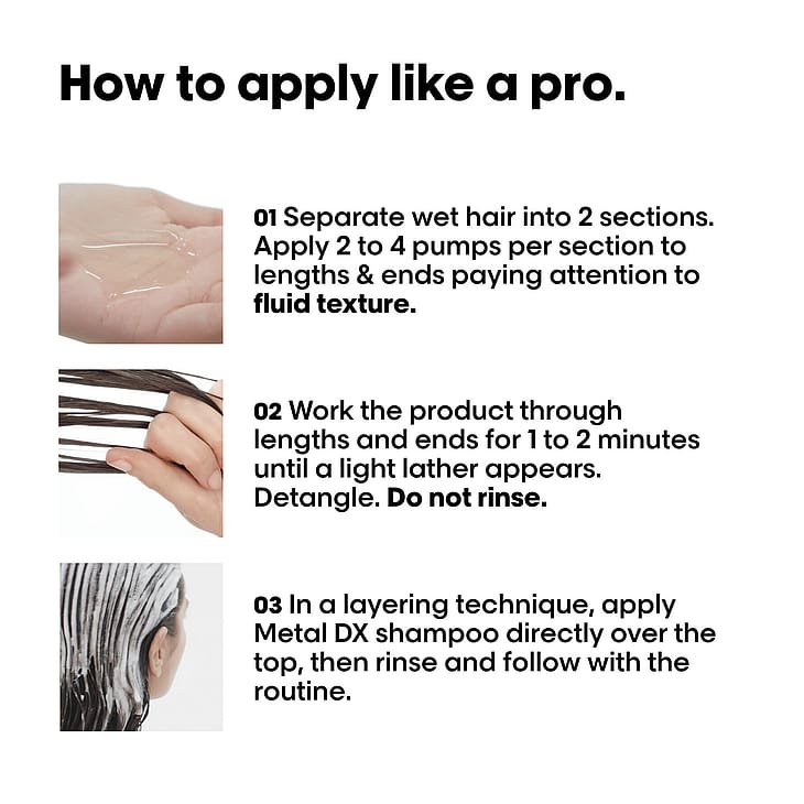 Jaa märät hiukset kahteen osioon. Levitä 2-4 pumppausta per osio, riippuen hiusten pituudesta. Hiero pituuksiin ja latvoihin 1-2 minuutin ajan. Älä huuhtele. Levitä sitten Metal DX -shampoo kerrostaen suoraan päälle, huuhtele ja jatka käyttämällä Metal DX -hiusnaamiota. Jos tuotetta joutuu silmiin, huuhtele ne välittömästi runsaalla vedellä.