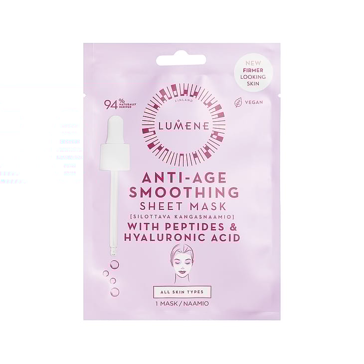 LUMENE Anti-age Silottava kangasnaamio auttaa tekemään ihosta täyteläisemmän, sileämmän ja kiinteämmän näköisen kangasnaamioon imeytyneen peptidejä ja hyaluronihappoa sisältävän seerumin avulla. Selluloosapohjainen, biohajoava kangasnaamio auttaa aktiiviaineita vaikuttamaan iholla ja estää kosteuden haihtumista, jättäen ihon miellyttävän ja pehmeän tuntuiseksi. Vegaaninen koostumus sopii kaikille ihotyypeille.