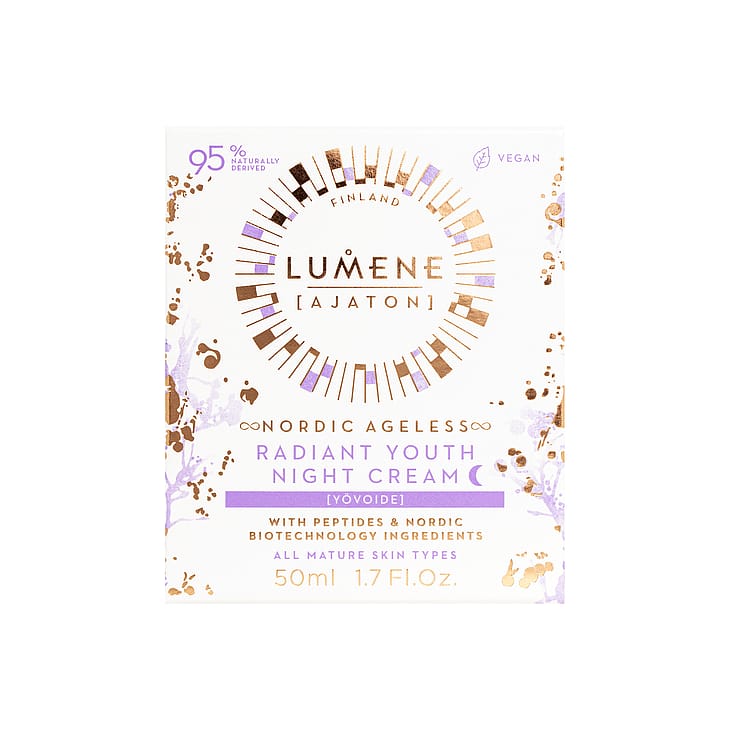 Luontaisen unirytmin inspiroima yövoide tukee ihosi luonnollista uudistumisprosessia yöllä, joka on erityisen tärkeä aika ihon uudistumisen ja palautumisen kannalta. Yövoiteen hoitava koostumus sisältää ihoa kiinteyttävää, kapseloitua kuparipeptidiä, suojaavaa puolukan kantasolua, kirkastavaa fermentoitua lakkaa ja rauhoittavaa kanervaa. Se auttaa häivytt ämään hienojen juonteiden ja ryppyjen näkymistä, tehden ihosta nuorekkaan ja hehkuvan näköisen yön aikana. 100% vegaaninen. Valmistettu Suomessa.