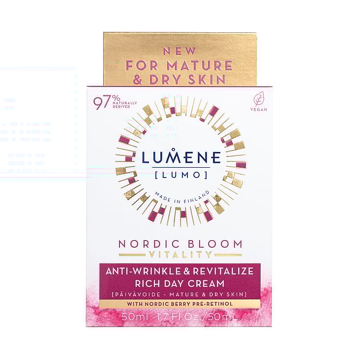 LUMENE Nordic Bloom [Lumo] Vitality Silottava & elvyttävä päivävoide ravitsee ikääntynyttä ja kuivaa ihoa koko päivän ja auttaa häivyttämään edenneitä ikääntymisen merkkejä: ryppyjä, sameutta, kuivuutta ja täyteläisyyden vähentymistä. Täyteläinen, pohjoisten marjojen pre-retinolia ja pohjoista maitohorsmaa sisältävä voide kosteuttaa tehokkaasti ja palauttaa ihon sileämmän, täyteläisemmän ja kimmoisan näköiseksi. Vegaaninen koostumus sisältää sivuvirroista saatavia ja luonnosta käsin poimittuja raaka-aineita. Valmistettu Suomessa.