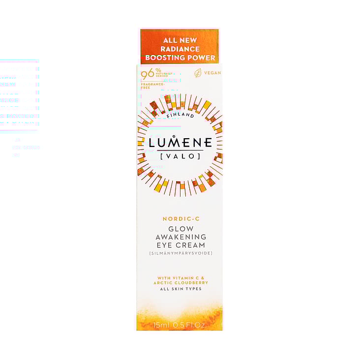 LUMENE [Valo] Nordic-C Heleyttävä silmänympärysvoide virkistää ja vähentää väsymyksen merkkejä, tummuutta, turvotusta ja ryppyjä, auttaen tekemään ilmeestä kirkkaamman ja virkistyneen näköisen. Hajusteeton koostumus sisältää ainutlaatuisen kirkastavan yhdistelmän antioksidanttipitoista pohjoista lakkaa ja C-vitamiinia. Yhdistettynä hyaluronihappoon ja polyglutamiiniin, tehokas koostumus antaa iholle ennennäkemätöntä hehkua. Vegaaninen koostumus sisältää sivuvirroista kehitettyjä ja pohjoisen luonnosta peräisin olevia raaka-aineita. Pakkauksessa on käytetty kierrätettyjä ja kierrätettäviä materiaaleja. Valmistettu Suomessa.