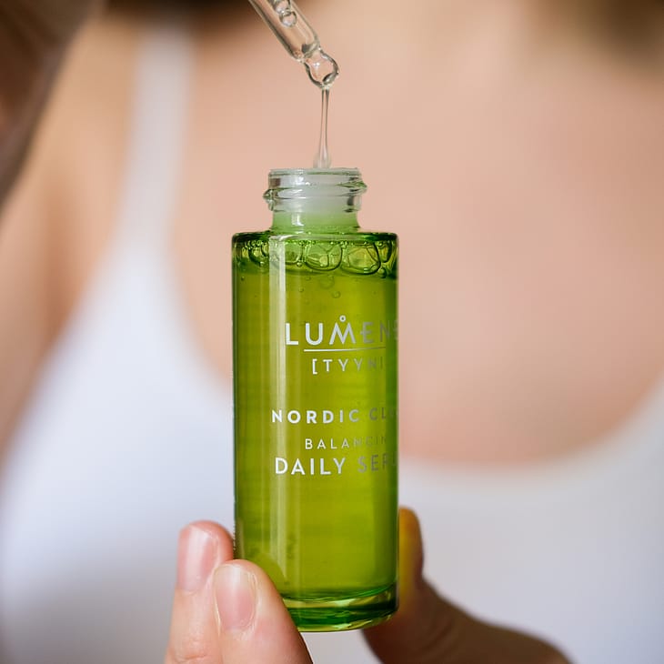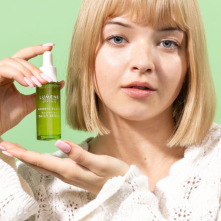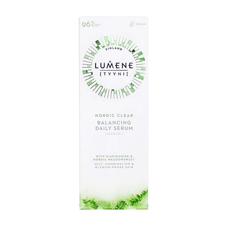 Lumene Tyyni Tasapainottava seerumi rasvoittuvalle, sekaiholle ja epäpuhtauksiin taipuvaiselle iholle sisältää tehokkaan yhdistelmän tasapainottavaa pohjoista mesiangervoa ja rauhoittavaa pohjoista ruusujuurta. Se vähentää ylimääräistä kiiltoa, auttaa häivyttämään ihohuokosia, epäpuhtauksia ja punaisuutta, sekä kosteuttaa tehokkaasti. Sinkkiglukonaattia ja niasiiniamidia sisältävä kevyt vesipohjainen seerumi tuntuu raikkaalta ja imeytyy nopeasti ilman tahmeaa tunnetta, jättäen ihon luonnollisen mattapintaiseksi sekä tasapainoisen ja hyvinvoivan näköiseksi. Seerumi on vegaaninen ja sisältää sivuvirroista saatavia ja pohjoisen luonnosta peräisin olevia raaka-aineita. Pakkauksessa on käytetty kierrätettäviä ja kierrätettyjä materiaaleja. Valmistettu Suomessa.