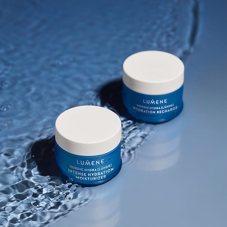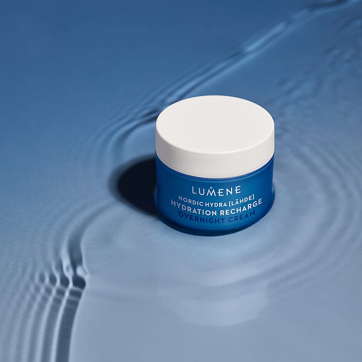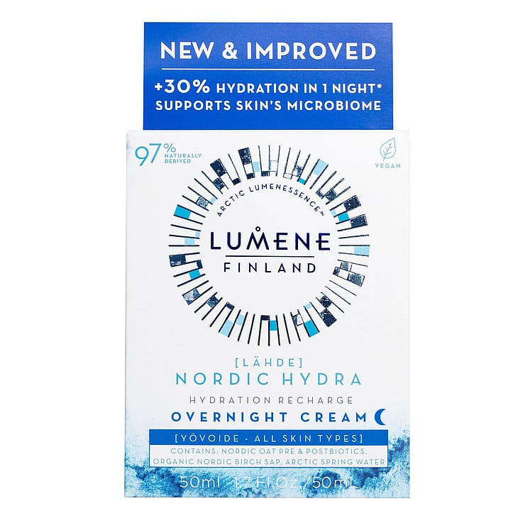 LUMENE Nordic Hydra Hydration Recharge Overnight Cream yövoide kosteuttaa tehokkaasti ja säilyttää ihon kosteuden yön aikana, sekä täydentää ihon luonnollista mikrobiomia. Täyteläinen mutta kevyt koostumus sisältää kosteuttavaa pohjoista luomu koivunmahlaa, puhdasta pohjoista lähdevettä, täyteläistävää hyaluronihappoa sekä suomalaisen kauran pre- ja postbioottia. Aamulla iho näyttää hyvinvoivalta ja uudistuneelta. Sopii kaikille ihotyypeille. Vegaaninen koostumus sisältää sivuvirroista saatavia ja luonnosta käsin poimittuja raaka-aineita. Valmistettu Suomessa.