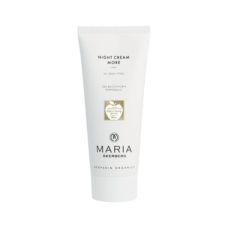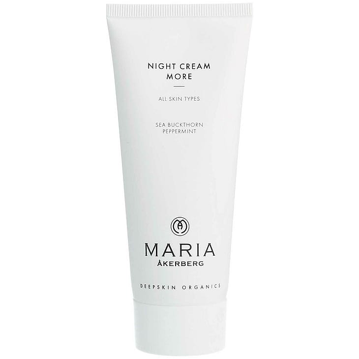 Night Cream More -yövoiteella on ylellinen ja ihoa uudistava koostumus, joka antaa iholle raikkaan tuoksun ja silottaa ihoa. Night Cream More on osa Maria Åkerbergin More-tuotesarjaa ja sopii erinomaisesti aikuiselle iholle. Tyrniöljyä, appelsiiniöljyä, ruusuöljyä ja minttua sisältävällä yövoiteella on kosteuttava vaikutus ja samalla se virkistää ihoa sekä ehkäisee ikääntymisen merkkejä. Sisältää runsaasti antioksidantteja, rasvahappoja ja C-vitamiinia, jotka vahvistavat tehokkaasti ihon suojakerrosta yön aikana.