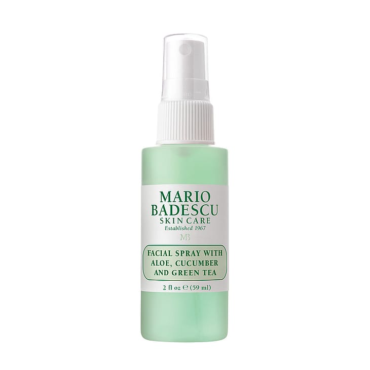 Mario Badescu Facial Spray With Aloe, Cucumber & Green Tea on virkistävä kasvosuihke, joka sisältää sameaa ihoa elvyttävää kurkku-uutetta ja piparminttua. Suihkeen viilentävä koostumus sisältää antioksidanttista vihreä tee -uutetta, joka kosteuttaa ihoa ja luo sille ihanan raikkaan ja virkistävän tunteen. Tuote on vegaaninen.