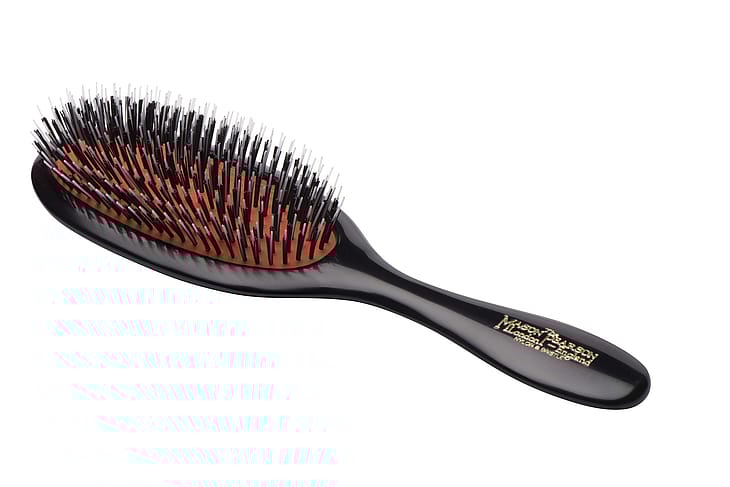 Mason Pearson BN3 'Handy Bristle and Nylon' -harja on pienempi harja, erityisesti suunniteltu puhdistamaan, selvittämään ja elvyttämään normaalista paksuun keskipitkään tukkaan.