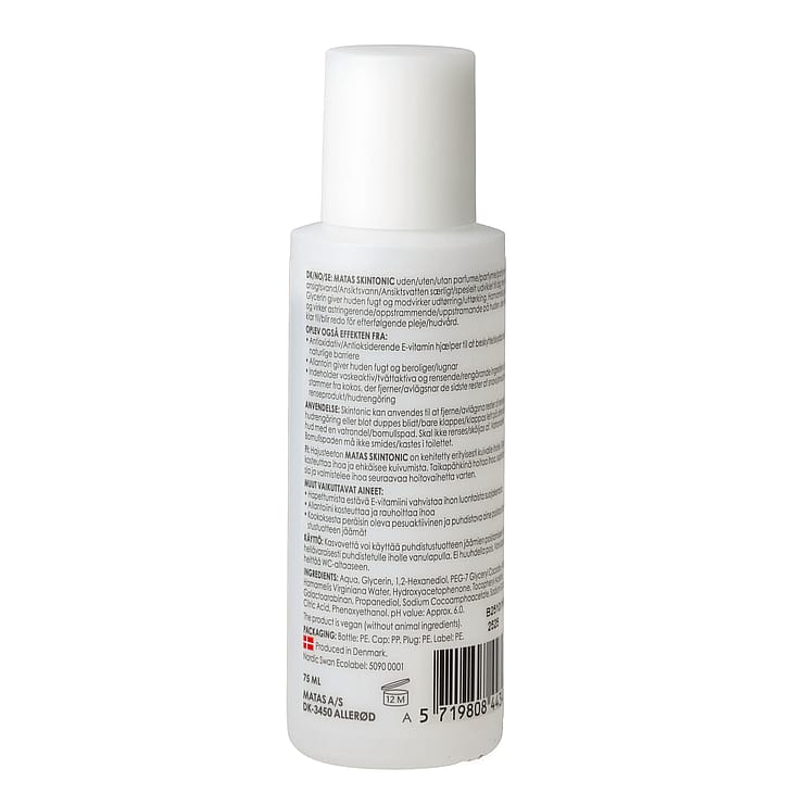 Matas Skintonic sisältää puhdistavaa ainesosaa kookoksesta, joka poistaa mahdolliset epäpuhtauksien tai puhdistusaineen jäämät. Glyseriini kosteuttaa ihoa ja ehkäisee kuivumista. Hamamelis hoitaa ja supistaa ihoa. Antioksidanttinen E-vitamiini suojaa ihon luonnollista suojakerrosta ja allantoiini kosteuttaa ja rauhoittaa ihoa.