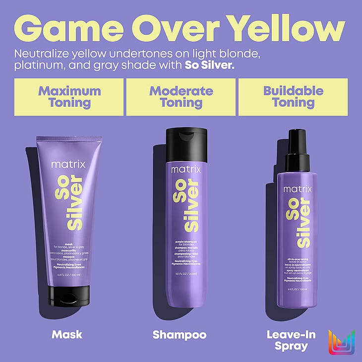 Matrix So Silver Purple Shampoo puhdistaa ja alkaa neutraloida heti ensimmäisestä käyttökerrasta lähtien neutraloimalla ei-toivotut keltaiset pohjasävyt ja ravitsee vaaleita hiuksia. Se kirkastaa vaaleiden hiuksien raitoja ja lisää kirkkautta värjättyihin ja ei-värjättyihin hiuksiin harmaista valkoisiin sävyihin. *käytettäessä hoitomentelmää koostuen So Silver -shampoosta ja -hoitoaineesta tai So Silver -shampoosta ja So Silver -hiusnaamiostaMatrix So Silver -shampoo on puhdistava shampoo, joka neutraloi vaaleiden hiusten lämpimiä ja himmeitä, keltaisia sävyjä. Tämä violetteja pigmenttejä sisältävä shampoo auttaa pitämään hiuksesi kirkkaina ja vaaleina! Sopii värjätyille ja värjäämättömille hiuksille vaaleissa tai hopean sävyissä.