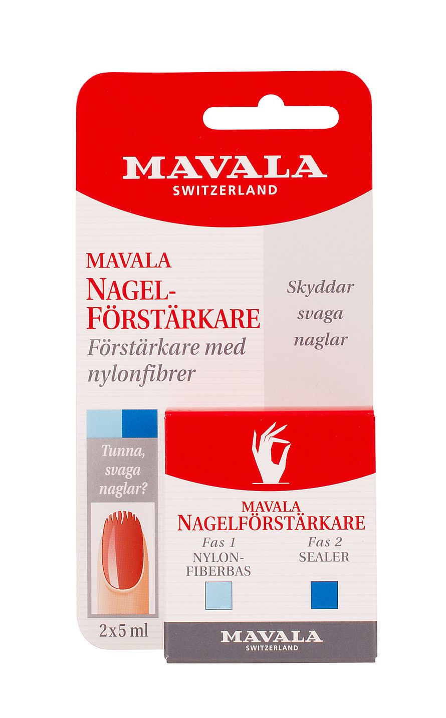 Mavalan kaksivaiheinen kynnenlujittaja suojaa ohuita ja pehmeitä kynsiä. Vaihe 1, nailonkuituvahvistaja, muodostaa kynnen pinnalle suojaavan verkon ja vaihe 2, tasoittaja, tasoittaa kynnen pinnan.