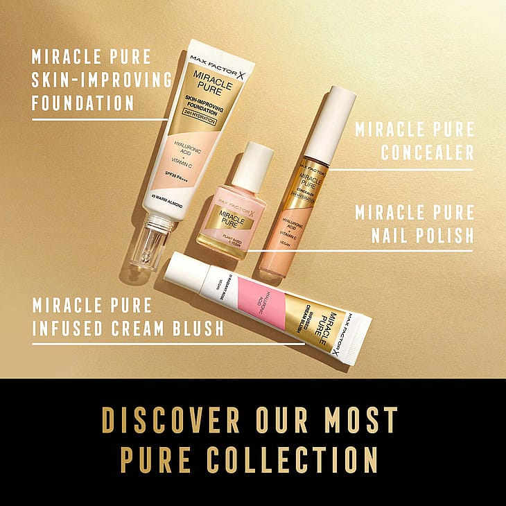 Max Factor esittelee uusimman ihmeensä Miracle Pure Skin-Improving Foundation. Meikkivoide on ihonhoidon ja kasvojenhoidon inspiroima, Max Factorilta. Meikki rikastettu hyaluronihapolla, ja tässä meikkivoiteessa yhdistyy kasvojenhoito ja kosmetiikka. On kliinisesti todistettu, että ihon hoito vain yhden minuutin ajan ja yhdellä tipalla ei anna iholle vain kaunista täyteläisyyttä vaan myös viisi muuta etua: enemmän heleyttä, voimaa, joustavuutta, kiinteyttä ja kimmoisuutta.-Se sisältää 89 % ihoa hoitavia ainesosia, kuten kollageenia vahvistavaa yhdistettä, C-vitamiinia ja hyaluronihappoa, ja kosteutta 24 tunnin ajan. Sopii täydellisesti kuivalle iholle. Kaikki tarvittava loistavalle meikkipohjalle samalla, kun iho voi hyvin.-- Miracle Pure Skin-Improving Foundation 16 sävyllä- Keskipeittävä, jota voidaan lisätä- SPF 30PA+++ UVA/UVB-Dermatologisesti testattu- Sopii kaikille ja erityisesti silloin, jos etsit yhdistettyä meikkivoidetta ja ihon hoitotuotetta