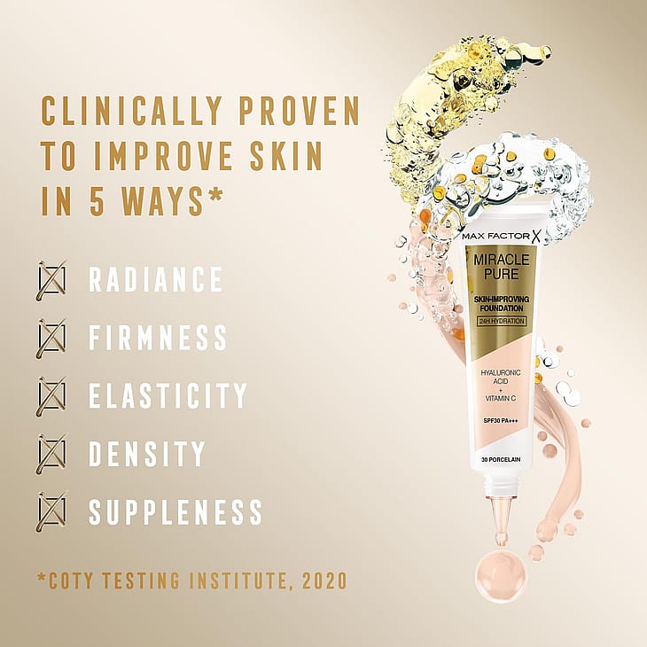 Max Factor esittelee uusimman ihmeensä Miracle Pure Skin-Improving Foundation. Meikkivoide on ihonhoidon ja kasvojenhoidon inspiroima, Max Factorilta. Meikki rikastettu hyaluronihapolla, ja tässä meikkivoiteessa yhdistyy kasvojenhoito ja kosmetiikka. On kliinisesti todistettu, että ihon hoito vain yhden minuutin ajan ja yhdellä tipalla ei anna iholle vain kaunista täyteläisyyttä vaan myös viisi muuta etua: enemmän heleyttä, voimaa, joustavuutta, kiinteyttä ja kimmoisuutta.-Se sisältää 89 % ihoa hoitavia ainesosia, kuten kollageenia vahvistavaa yhdistettä, C-vitamiinia ja hyaluronihappoa, ja kosteutta 24 tunnin ajan. Sopii täydellisesti kuivalle iholle. Kaikki tarvittava loistavalle meikkipohjalle samalla, kun iho voi hyvin.-- Miracle Pure Skin-Improving Foundation 16 sävyllä- Keskipeittävä, jota voidaan lisätä- SPF 30PA+++ UVA/UVB-Dermatologisesti testattu- Sopii kaikille ja erityisesti silloin, jos etsit yhdistettyä meikkivoidetta ja ihon hoitotuotetta