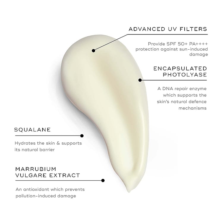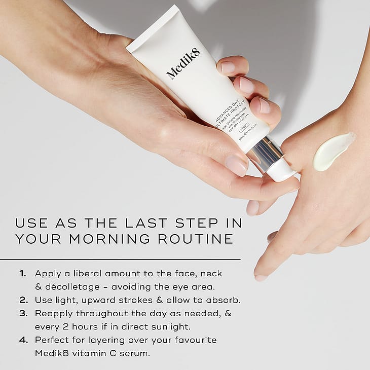 Medik8:n ylivertainen päivävoide, joka sisältää edistyneen, nykyaikaisen, laajakirjoisen SPF 50+ PA++++ UVA/UVB-suojan sekä ihanteellisen suojan ympäristön vaikutuksilta. Sisältää DNA:ta korjaavia entsyymejä, jotka tehostavat ihon luonnollista korjautumiskykyä. Miellyttävä koostumus imeytyy ihoon nopeasti. Sopii kaikille, jotka haluavat korkean aurinkosuojakertoimen päivävoiteessaan, sekä kuivalle ja erittäin kuivalle iholle.
