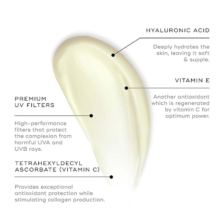 Aqua (Water), Tetrahexyldecyl Ascorbate, Diethylamino Hydroxybenzoyl Hexyl Benzoate, Dibutyl Adipate, Dimethicone, Ethylhexyl Triazone, Bis-Ethylhexyloxyphenol Methoxyphenyl Triazine, C12-15 Alkyl Benzoate, Dicaprylyl Carbonate, Cetearyl Alcohol, Glycerin, Coco-Glucoside, Phenoxyethanol, Acrylates/C10-30 Alkyl Acrylate Crosspolymer, Cetearyl Glucoside, Tocopheryl Acetate, Hydroxyacetophenone, Disodium EDTA, Benzoic Acid, Xanthan Gum, Citrus Grandis (Grapefruit) Peel Oil, Sodium Hydroxide, Dehydroacetic Acid, Sodium Hyaluronate, Citrus Limon (Lemon) Peel Oil, Citrus Aurantium Bergamia (Bergamot) Fruit Oil, Pelargonium Graveolens (Geranium) Flower Oil, Ethylhexylglycerin, Limonene, Citronellol, Linalool, Geraniol, Citral.