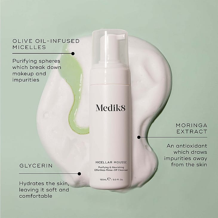Ympäristöystävällinen misellimousse (ei vaadi vanulappuja). Ei jätä iholle jäämiä. Ylellinen, täyteläisen voidemainen koostumus. Poistaa meikin nopeammin kuin misellivesi. Sulfaatiton – hyvä herkälle iholle! Moussemainen misellivesi. Sisältää ravitsevaa oliiviöljyä ja moringauutetta, joka irrottaa haitallisia epäpuhtauksia. Nopea ja helppo käyttä ä. Poistaa kaikki jäämät – ei tarvetta vanulapuille. Erittäin hellävarainen, sopii herkälle iholle. Micellar Mousse tekee ihosta kosteutetun, raikkaan ja puhtaan.