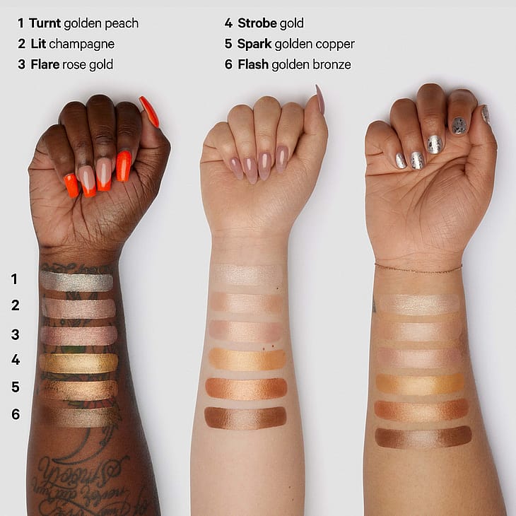 Lämmitä kämmenselässä ennen levittämistä, jotta koostumus liukuu iholle tasaisemmin. Levitä voidemainen highlighter suoraan poskipäille, kulmakarvojen alle ja kasvojen korkeisiin kohtiin. Häivytä sormin, siveltimellä tai meikkisienellä. Kerrosta saadaksesi intensiivisemmän lopputuloksen. Sopii käytettäväksi vartalolla: levitä solisluille, olkapäihin ja sääriin hehkun saamiseksi.
