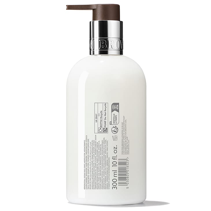 Molton Brown Bluebell & Wild Strawberry Body Lotion on kosteuttava vartaloemulsio, jolla on raikkaan keväinen tuoksu. Kypsien mansikoiden, kasteenraikkaan sinililjan ja hienovaraisen ajopuun hienostuneet nuotit ylistävät luonnon heräävää vihreyttä. Koostumuksen nopeasti imeytyvien öljyjen ansiosta ihosta tulee silkinpehmeä ilman tahmaista tunnetta – täydellinen suihkun jälkeen. Käytä yhteensopivan Molton Brown -suihkusaippuan kanssa viimeistelläksesi tuoksuelämyksen.