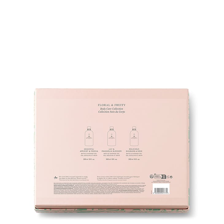 Floral & Fruity Body Care Gift Set -lahjasetti sisältää kolme ihanaa Molton Brown -suihkusaippuaa. Suihkuvoiteet sisältävät hedelmäisten ja kukkaisten nuottien ihanan yhdistelmän: mukana on makeaa aprikoosia, kirpeää raparperia ja kasteenraikasta kieloa. Setti sisältää suihkusaippuat Graceful Apricot & Freesia Bath & Shower Gel, Lily & Magnolia Blossom Bath & Shower Gel ja Delicious Rhubarb & Rose Bath & Shower Gel.