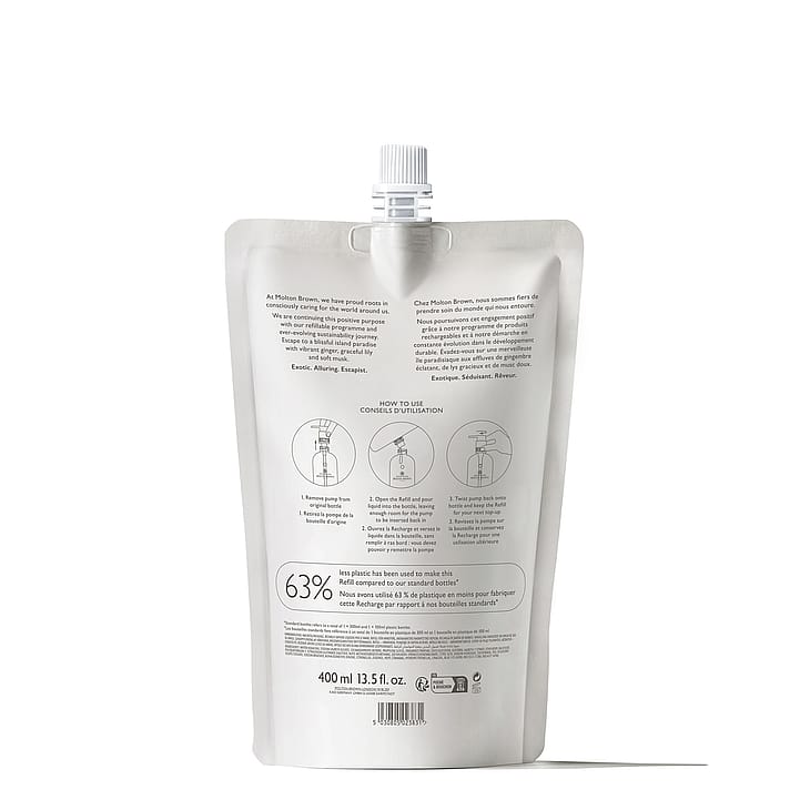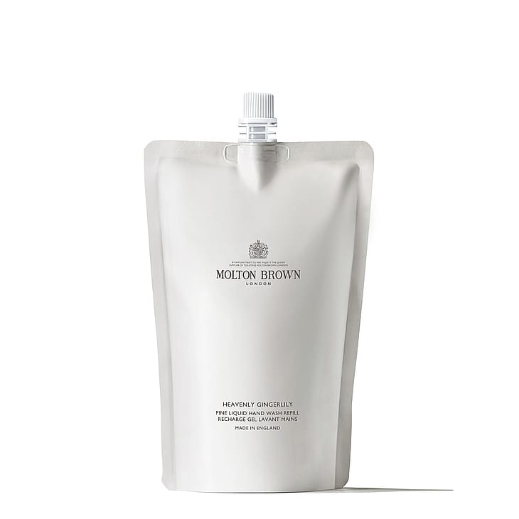 Molton Brown Heavenly Gingerlily Fine Liquid Hand Wash Refill -uudelleentäyttöpakkauksella täytät Molton Brown -muovi- tai lasipullosi uudestaan. Eloisan inkiväärin, elegantin liljan ja pehmeän myskin aistillisia nuotteja sisältävä ylellinen käsisaippua antaa miellyttävän ja puhdistavan kokemuksen. Puhdistaa, kosteuttaa ja antaa iholle lämpimän, eksoottisen tuoksun. Käytä yhteensopivan Molton Brown -käsiemulsion kanssa viimeistelläksesi tuoksuelämyksen. Uudelleentäyttöpakkaus sisältää 63 % vähemmän muovia kuin tavalliset Molton Brown -pullot.