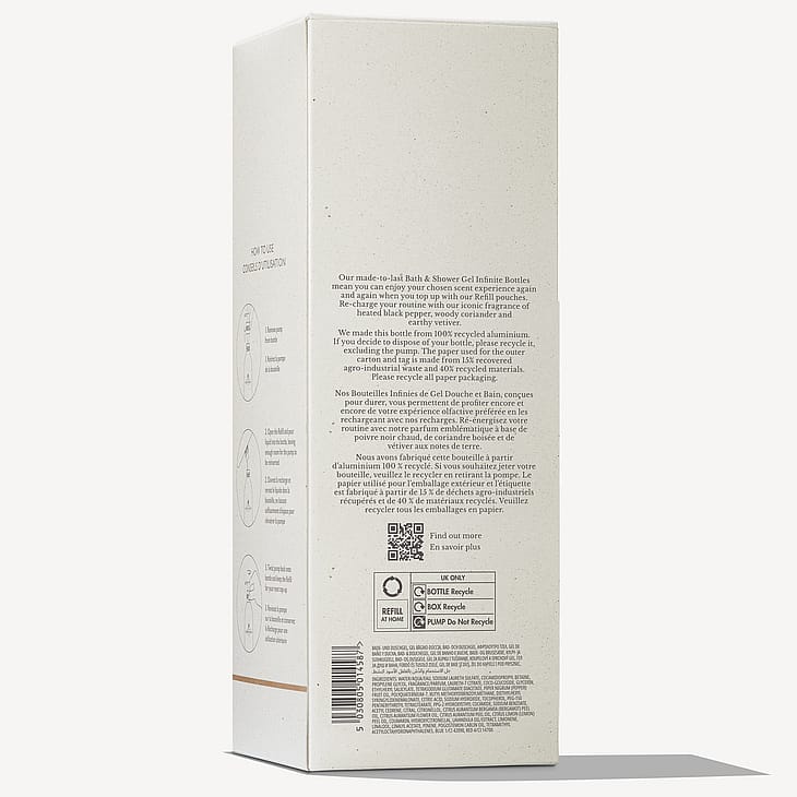 Molton Brown Infinite Bottle Re-Charge Black Pepper Bath & Shower Gel on ihana suihkusaippua vastuullisessa uudelleentäytettävässä pullossa, joka on valmistettu 100 % kierrätetystä alumiinista. Mausteisen mustapippurin, puuvivahteisen korianterin ja maanläheisen vetiverin lämpimiä nuotteja sisältävä aromaattinen suihkusaippua antaa kylpy- ja suihkurituaalillesi ripauksen ylellisyyttä, puhdistaa ihoa ja antaa sille ihanan tuoksun. Käytä yhdessä yhteensopivan Molton Brown -vartaloemulsion kanssa viimeistelläksesi tuoksuelämyksen.