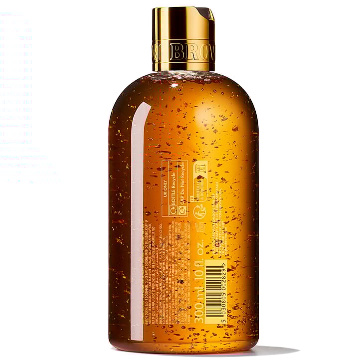 Molton Brown Mesmerising Oudh Accord & Gold Bath & Shower Gel antaa kylpy- ja suihkurituaalillesi ripauksen ylellisyyttä. Sisältää raikkaan bergamotin, savuisen mustan teen ja hunajaisen hartsin nuotteja. 23,5 karaatin kultahiukkasia sisältävä ylellinen suihkugeeli puhdistaa ihon ja antaa sille ihanan tuoksun. Käytä yhdessä yhteensopivan Molton Brown -vartaloemulsion kanssa viimeistelläksesi tuoksuelämyksen.