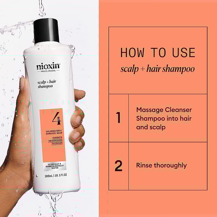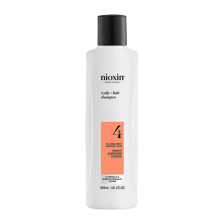 Nioxin System 4 Cleanser -shampoo värjätyille, selvästi ohentuneille hiuksille. Kolmiosaisen Nioxin-hiustenhoitojärjestelmän ensimmäinen vaihe. Shampoo vahvistaa hiuksia ja hiusten rakennetta, puhdistaa ja poistaa lian, ylimääräisen talin ja muut ympäristöjäämät hiuspohjasta ja hiuksista. Kliinisesti ja dermatologisesti testattu shampoo sisältää valkoista teeuutetta. Kosteuttaa hiuspohjaa ja hiuksia tyvestä latvaan ja tekee hiusrakenteesta paksumman ja vahvemman. Saat parhaan lopputuloksen käyttämällä yhdessä Nioxin System 4 -hoitoaineen ja Nioxin System 4 Treatmentin kanssa. Saatavana kaksi kokoa: 300 ml ja 1000 ml.
