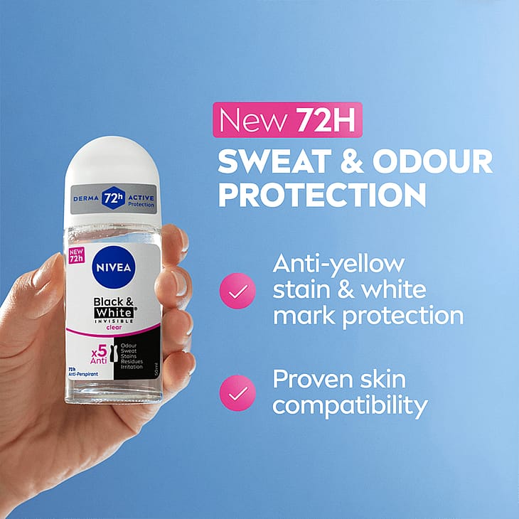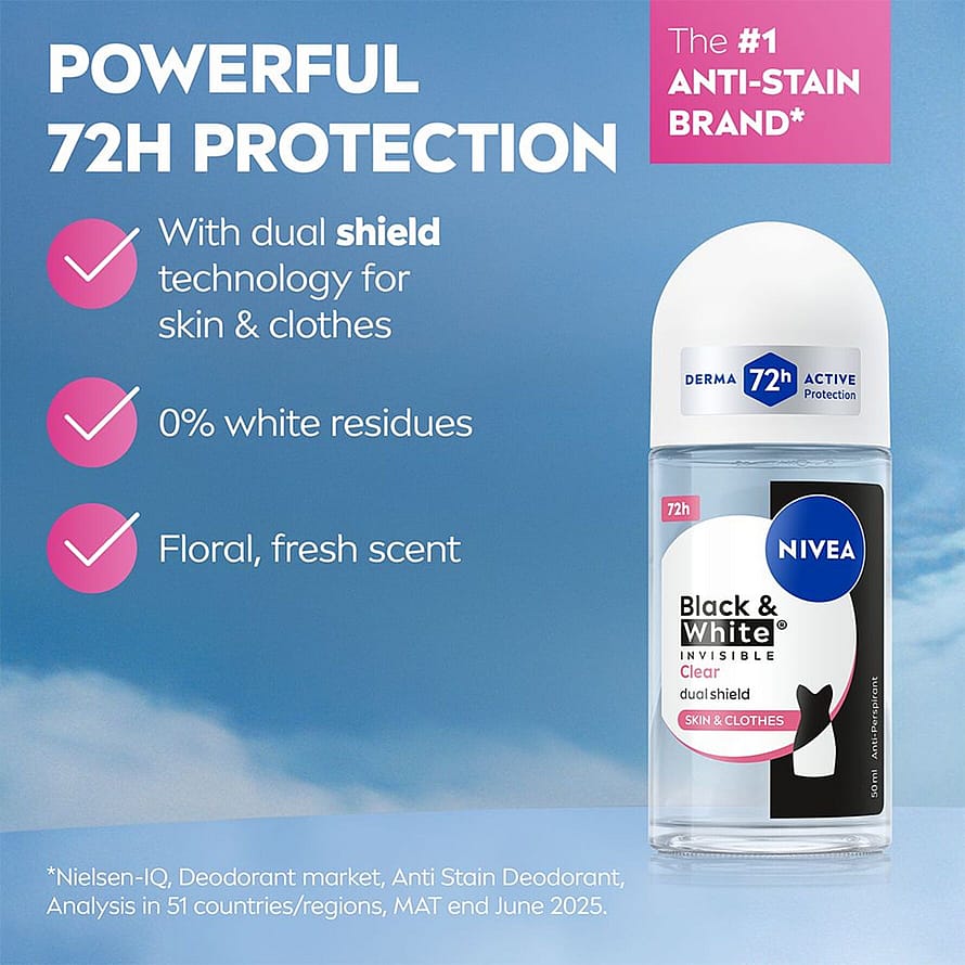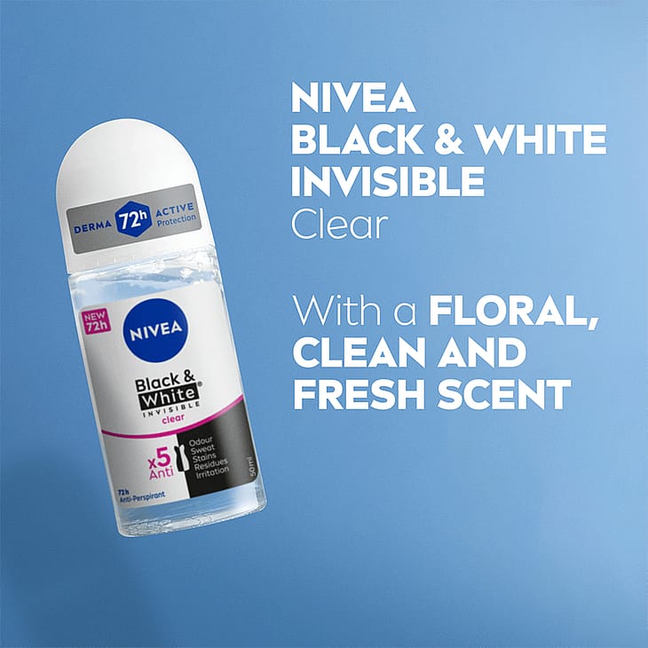 NIVEA Black & White Invisible Original Deo Roll-on -antiperspirantti antaa tehokkaan ja luotettavan 72 tunnin antiperspiranttisuoja, joka hoitaa ihoa. Suojaa mustia vaatteita valkoisilta jäljiltä ja ehkäisee keltaisten tahrojen syntymistä valkoisiin vaatteisiin. Hellävarainen, hoitava koostumus. Iho tuntuu puhtaalta ja raikkaalta. Miellyttävä, raikas tuoksu. Ei sisällä etyylialkoholia. Dermatologisesti testattu. Kierrätettävä pakkaus.