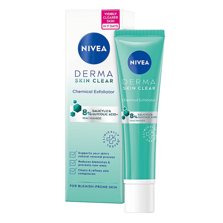 NIVEA Derma Skin Clear Chemical Exfoliator - kemiallinen yökuorintavoide kasvoille, sisältää korkean pitoisuuden (8%) AHA/BHA-happoja (glykoli- ja salisyylihappo) ja niasiiniamidia. Tukee ihon luonnollista uusiutumisprosessia ja parantaa ihon rakennetta jo 7 päivässä. Antibakteerinen koostumus vähentää epäpuhtauksia ja ehkäisee niiden syntymistä. Yökuorinta tekee ihosta näkyvästi puhtaamman ja kirkkaamman, antaen näkyvät tulokset jo 7 päivässä. Vegaaninen koostumus.