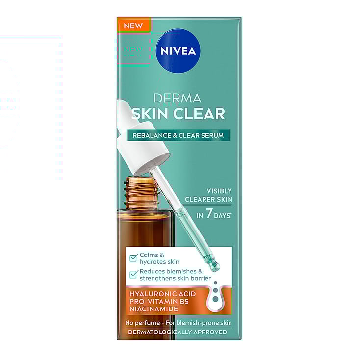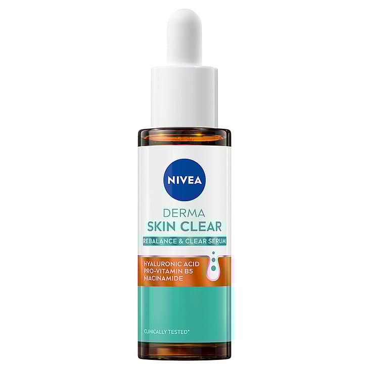 NIVEA Derma Skin Clear Rebalance & Clear -seerumi on kehitetty erityisesti stressaantuneelle, epäpuhtauksiin taipuvaiselle iholle. Hajusteeton hyaluronihappoa, B5-provitamiinia ja niasiiniamia sisältävä koostumus rauhoittaa ja kosteuttaa ihoa sekä vahvistaa sen suojamuuria. Tekee ihosta terveen ja hyvinvoivan näköisen. Lisäksi se vähentää epäpuhtauksia, jolloin iho kirkastuu ja huokoset puhdistuvat, näkyviä tuloksia jo 7 päivässä! Vegaaninen, öljytön koostumus ei tuki ihohuoksia ja imeytyy nopeasti. Ihoystävällisyys on dermatologisesti hyväksytty ja tehokkuus epäpuhtauksiin taipuvaisella iholla on kliinisesti testattu. Yhdistä seerumi muihin NIVEA Derma Skin -tuotteisiin, niin saat parhaan lopputuloksen!