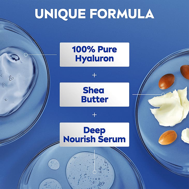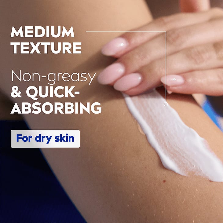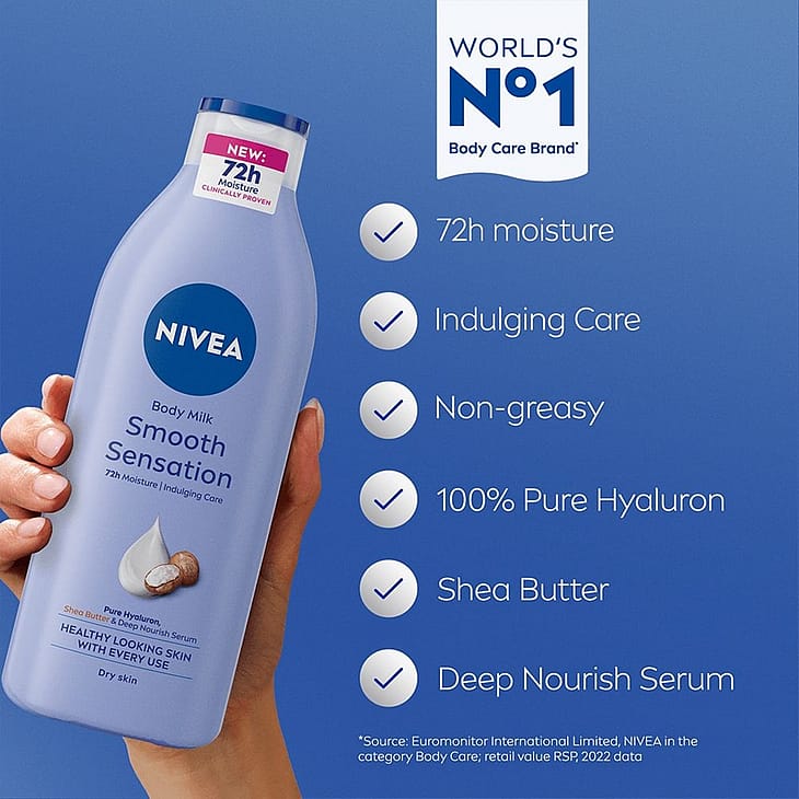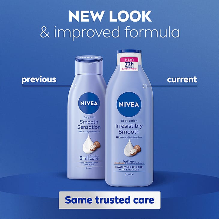 NIVEA Irresistibly Smooth Body Lotion -vartaloemulsio tekee ihosta terveen näköisen ja syväkosteuttaa sitä 72 tuntia. Tekee ihosta silkkisen sileän tuntuisen. Sisältää puhdasta hyaluronihappoa, sheavoita ja ihoa syvältä ravitsevaa seerumia. Ei jätä tahmaista tunnetta ja imeytyy nopeasti. 50% kierrätetystä muovista valmistettu pullo (pois lukien korkin). Dermatologisesti testattu.