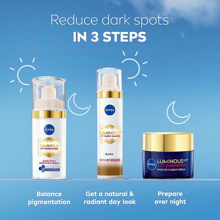 NIVEA Luminous630 Anti Dark Marks CC Fluid Dark SK30 - sävyttävä päivävoide antaa ihollesi kolmoisvaikutuksen: (1) Peittää: Ihon sävyyn mukautuvat mikrokapseloidut pigmentit antavat luonnollisen peittävyyden ja tasoittavat välittömästi tummia läiskiä ja epätasaisuuksia. (2) Vähentää: Thiamidolia® sisältävä koostumus vähentää pigmenttiläiskiä näkyvästi 2 viikossa ja tasoittaa ihonväriä + 40 % 8 viikossa.* (3) Suojaa: SK30:n sisältävä koostumus suojaa ihoa auringolta ja estää uusien pigmenttiläiskien syntymistä. Miellyttävä koostumus tekee ihosta kauniin tasaisen ja säteilevän.