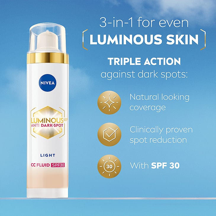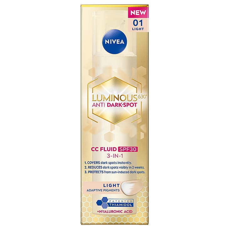 NIVEA Luminous630 Anti Dark Marks CC Fluid Dark SK30 - sävyttävä päivävoide antaa ihollesi kolmoisvaikutuksen: (1) Peittää: Ihon sävyyn mukautuvat mikrokapseloidut pigmentit antavat luonnollisen peittävyyden ja tasoittavat välittömästi tummia läiskiä ja epätasaisuuksia. (2) Vähentää: Thiamidolia® sisältävä koostumus vähentää pigmenttiläiskiä näkyvästi 2 viikossa ja tasoittaa ihonväriä + 40 % 8 viikossa.* (3) Suojaa: SK30:n sisältävä koostumus suojaa ihoa auringolta ja estää uusien pigmenttiläiskien syntymistä. Miellyttävä koostumus tekee ihosta kauniin tasaisen ja säteilevän.