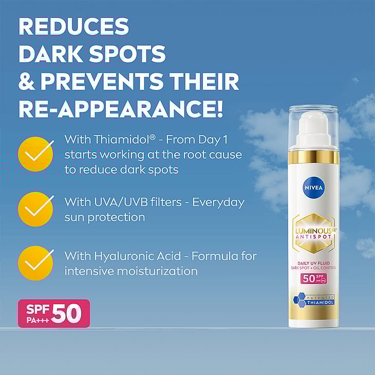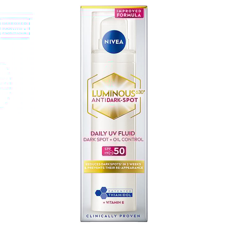 NIVEA Cellular Luminous630 Anti Dark-Spot Day Fluid SPF50 -päivävoide suojaa jo olemassa olevia pigmenttiläiskiä tummenemiselta ja ehkäisee niiden uudelleensyntymistä. Se ehkäisee myös ihon valovanhenemista samalla kun se kosteuttaa ihoa. Päivävoide yhdistää innovatiivisen LUMINOUS630:n, suojakertoimen SPF50, soluja aktivoivan hyaluronihapon* ja E-vitamiinin. Uudistettu koostumus sisältää nyt tuplasti E-vitamiinia edelliseen koostumukseen verrattuna. Voide tekee ihosta sileän, kauniin säteilevän ja mattapintaisen. Sopii hyvin meikin alle.