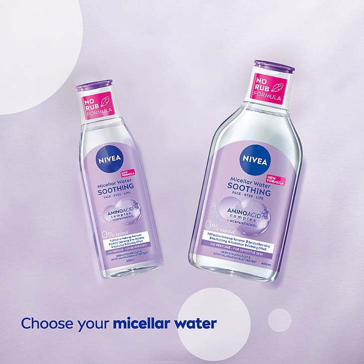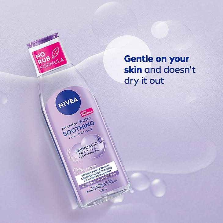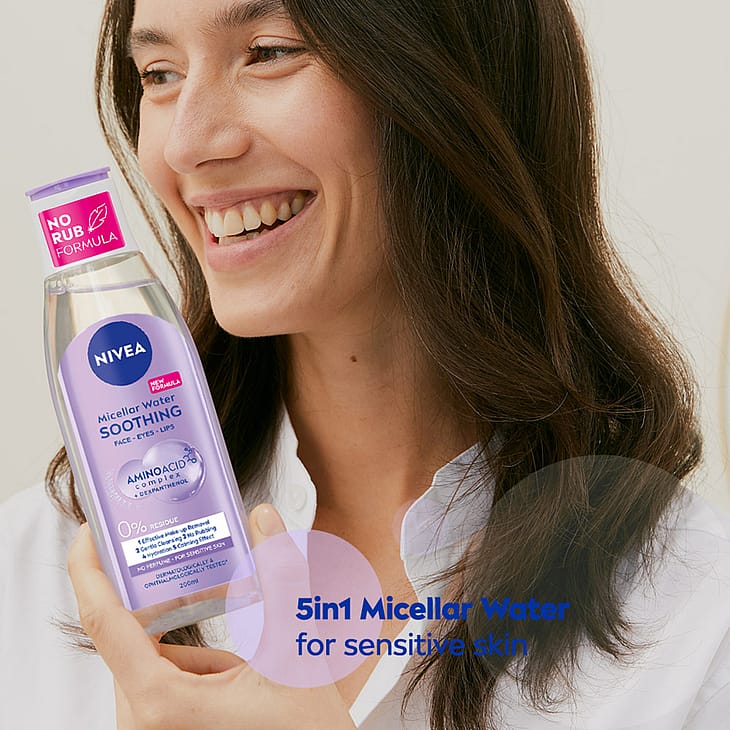 Erityisesti herkälle iholle kehitetty NIVEA Soothing Micellar Water -misellivesi poistaa meikin, puhdistaa ja rauhoittaa ihoa, jättämättä tuote- tai meikkijäämiä iholle. Rauhoittava koostumus sisältää Amino Acid Complex -aminohappoyhdisteen ja dekspantenolia. Hajusteeton misellivesi yhdistää tehokkaat misellit ja hellävaraiset aminohapot. Poistaa tehokkaasti meikin, epäpuhtaudet ja lian vain muutamalla höyhenenkevyellä pyyhkäisyllä, ei tarvetta hankaukselle! Testattu ihotauti- ja silmälääkäreiden valvonnassa. Vegaaninen koostumus.