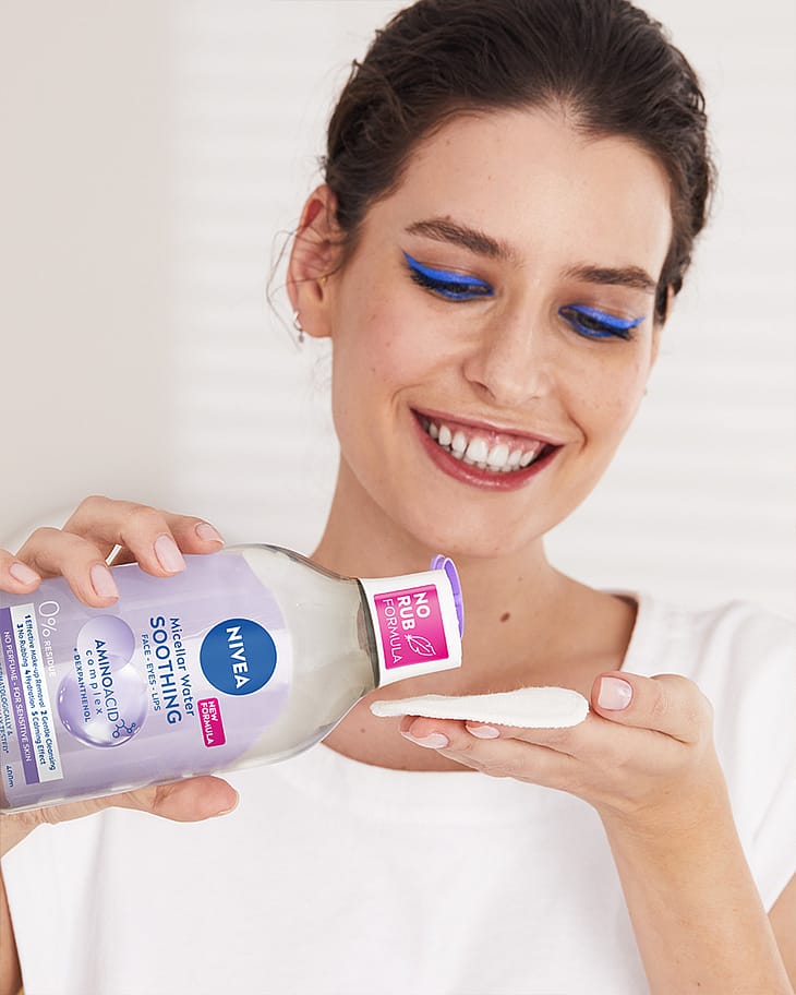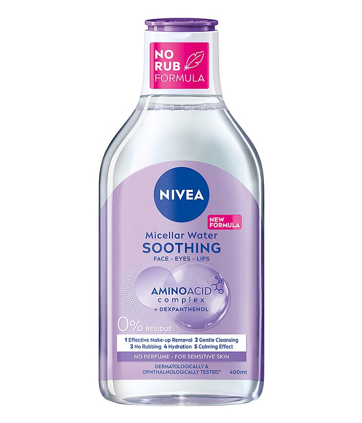 Erityisesti herkälle iholle kehitetty NIVEA Soothing Micellar Water -misellivesi poistaa meikin, puhdistaa ja rauhoittaa ihoa, jättämättä tuote- tai meikkijäämiä iholle. Rauhoittava koostumus sisältää Amino Acid Complex -aminohappoyhdisteen ja dekspantenolia. Hajusteeton misellivesi yhdistää tehokkaat misellit ja hellävaraiset aminohapot. Poistaa tehokkaasti meikin, epäpuhtaudet ja lian vain muutamalla höyhenenkevyellä pyyhkäisyllä, ei tarvetta hankaukselle! Testattu ihotauti- ja silmälääkäreiden valvonnassa. Vegaaninen koostumus.