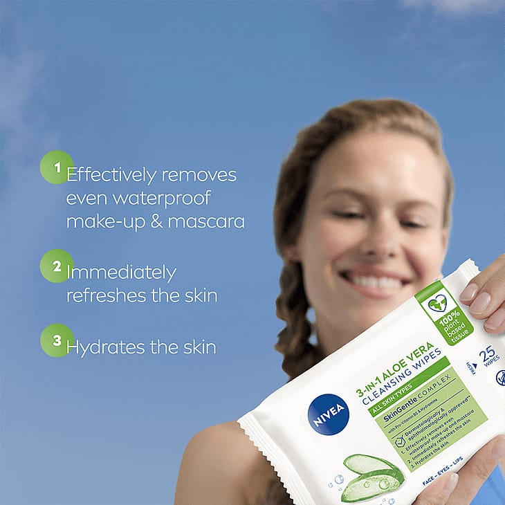 NIVEA Naturally Good Cleansing Wipes -puhdistusliinat poistavat jopa vedenkestävän meikin ja ripsivärin. Kosteuttavaa ja raikastavaa luomu aloe veraa sisältävät puhdistusliinat eivät kuivata ihoa ja ne sopivat jopa herkälle iholle. Ihosta tulee raikas ja puhdas. Biohajoavien puhdistusliinojen materiaali on 100% luonnosta peräisin olevaa kasvikuitua ja 45% pakkauksesta on tehty kierrätetystä materiaalista. Puhdistusliinojen puhdistava ja kosteuttava koostumus sisältää 97% luonnosta peräisin olevia ainesosia. Koostumus on mikromuoviton ja vegaaninen. Sopii päivittäiseen käyttöön.