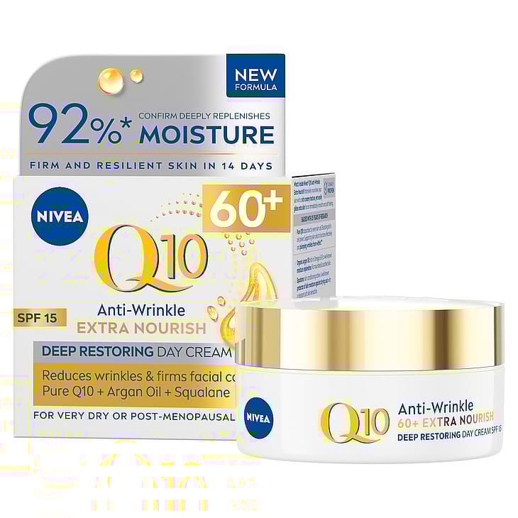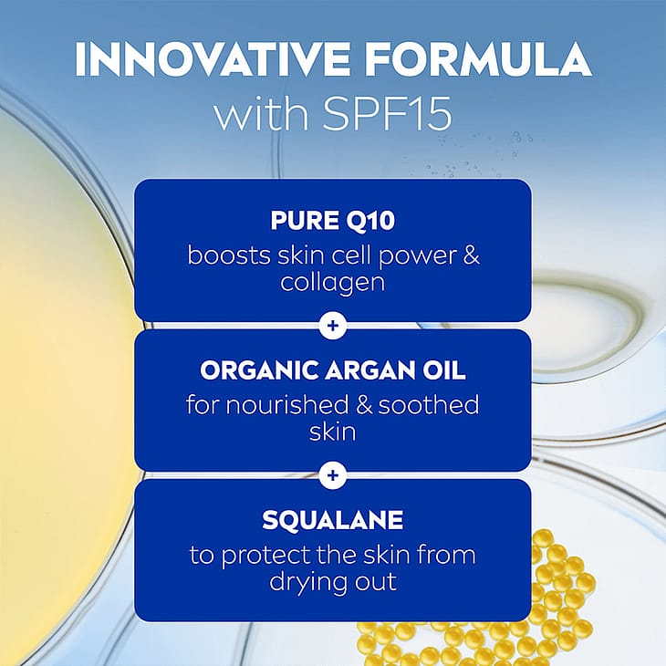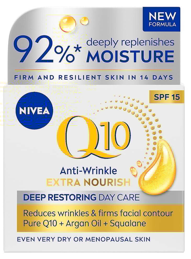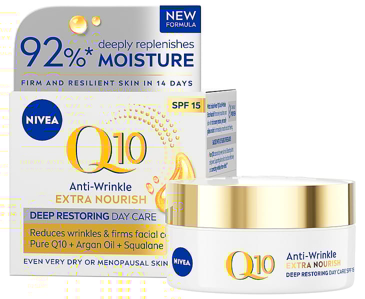 NIVEA Q10 Anti-Wrinkle Extra Nourish Deep Restoring Day Cream SK15 -päivävoide sisältää puhdasta Q10:ntä, joka antaa ihosoluille energiaa ja korjaa ryppyjä sisältäpäin*, luomu arganöljyä, joka hoitaa ja kosteuttaa ihoa tehokkaasti, sekä skvalaania, joka vahvistaa ihoa ja ehkäisee sen kuivumista. Kasvovoide antaa iholle tehokasta hoitoa ja tekee siitä miellyttävän pehmeän tuntuisen. Suojakerroin SK 15 ja UVA/UVB-suodattimet suojaavat kasvojen herkkää ihoa UV-säteiden aiheuttamilta vanhenemisen merkeiltä. Sopii erittäin kuivalle tai vaihdevuosi-ikäiselle iholle. Tehokkuus kliinisesti todistettu. Dermatologisesti testattu.